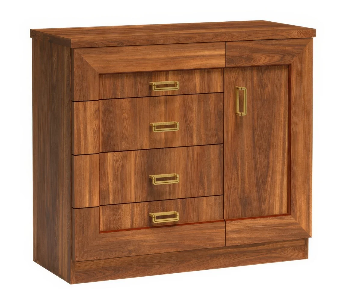 Komoda v dekoru dub stoletý z řady ACHAO spojuje nadčasový vzhled s praktickým řešením úložného prostoru. Má dvířka a čtyři zásuvky; za dvířkami se nachází police pro přehledné uložení věcí.
