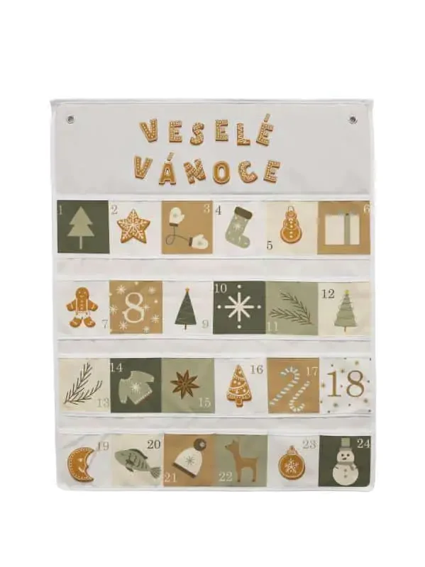 Stylový adventní kalendář z plátna s kapsami pro denní překvapení. Do jednotlivých kapes můžete připravit sladkosti, drobné hračky, sponky či barvičky – podle vaší kreativity. Kalendář je odolný a díky snadnému mytí mýdlovou vodou vydrží roky, čímž šetříte přírodu.