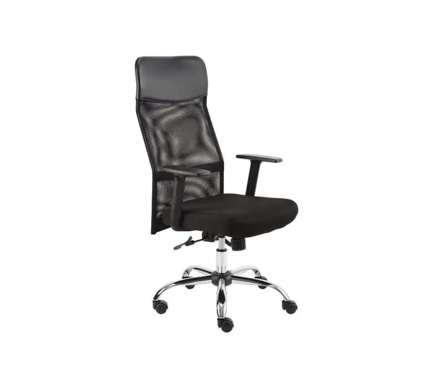 Sedák je potažen prodyšnou černou látkou a opěrák kombinuje síťovinu s černou koženkovou výstelkou v oblasti hlavy. Šířka sedáku činí 46 cm. Píst a kříž jsou chromované a doplněné kolečky o průměru 50 mm. Křeslo je vhodné pro běžné kancelářské prostředí i domácí pracoviště a dodává se v demontovaném stavu; nabízíme možnost montáže. ergonomické řešení pro dlouhodobé sezení, které pomáhá udržet správné držení a snížit únavu.