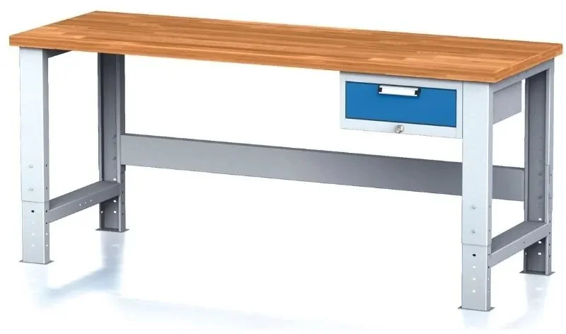 Součástí je závěsný box na nářadí s jednou zásuvkou, která je centrálně zamykatelná a unesou až 40 kg, přičemž plně vysouvatelný mechanismus umožňuje snadný přístup ke všem uloženým nástrojům. Stůl je vybaven nastavitelnou policí s nosností 40 kg, kterou lze posunout po 25 mm pro maximální přizpůsobení. Pracovní plocha je vyrobena z pevné bukové spárovky o tloušťce 40 mm, ošetřené lněným olejem, což zajišťuje dlouhou životnost a odolnost. Korpus a podnož jsou opatřeny odolným práškovým lakem v moderním odstínu RAL 7035, který odolává opotřebení. Tento multifunkční pracovní stůl doporučujeme všem, kdo potřebují efektivní skladování a pevnou pracovní plochu pro náročné dílenské práce.