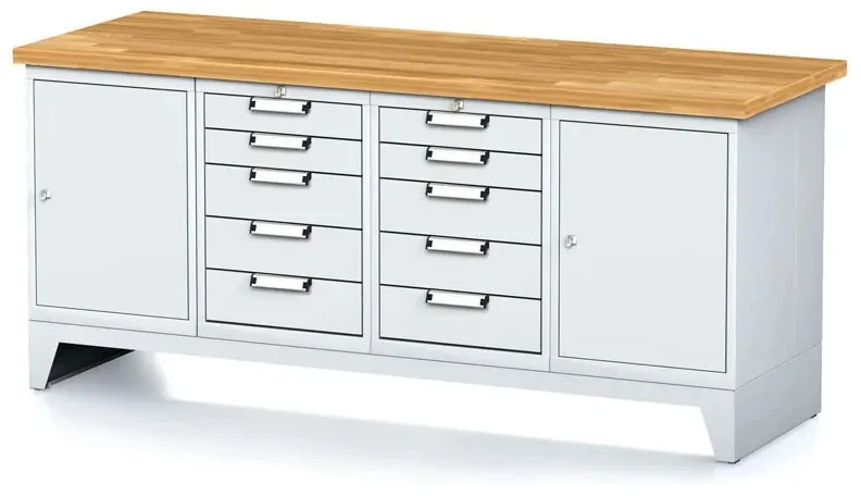 Díky pevné ocelové konstrukci je možné stůl snadno přemísťovat pomocí vysokozdvižného vozíku, což usnadňuje manipulaci. Pracovní deska z bukové spárovky o tloušťce 40 mm je ošetřena lněným olejem, což zajišťuje její dlouhou životnost a snadnou údržbu. Všechny zásuvky jsou vybaveny teleskopickými kuličkovými výsuvy s celkovým výsuvem 100 % a nosností 40 kg, což umožňuje pohodlné a bezpečné uspořádání vašeho nářadí. Tento robustní stůl je perfektním řešením pro efektivní organizaci vaší dílny, ať už doma nebo v profesionálním prostředí.