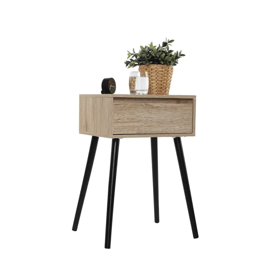 ALYSANDRA TYP 1 je stylový noční stolek, který zaujme díky svému čistému designu a nadčasové eleganci. Vrchní deska je z foliované DTD v dekoru dub, zatímco nohy jsou masivní a černé, což dodává kontrast a stabilitu. Tento kousek dobře poslouží jako praktický odkládací prostor v ložnici i obývacím pokoji a působí minimalisticky a elegantně. Rozměry (šířka x hloubka x výška): 40 x 30 x 60 cm. Dodává se v demontu; montáž je rychlá a snadná.