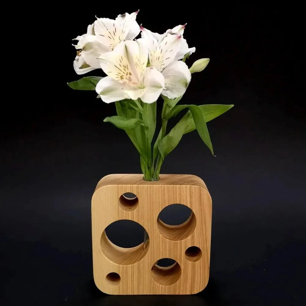 Tato elegantní váza z masivního jasanového dřeva v moderním čtvercovém designu s kulatými prořezy přinese přírodní atmosféru do vašeho interiéru. S výškou 12 cm a rozměry 12 x 12 cm je ideální pro menší květiny či dekorativní aranžmá.