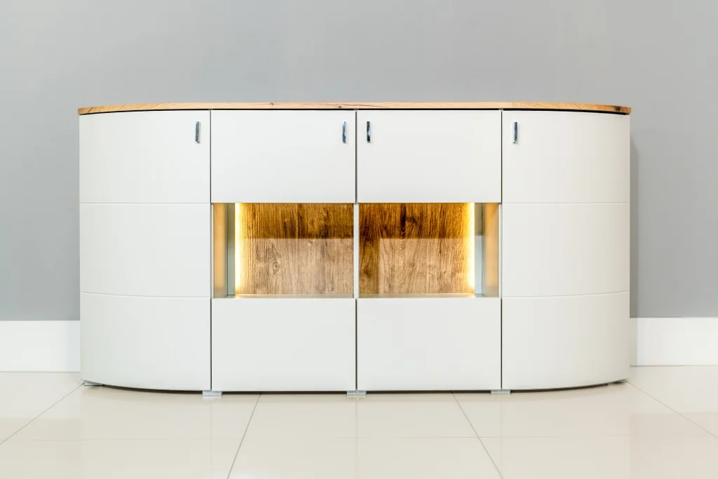 Povrch z lamina se sklem je snadno udržovatelný a odolný vůči běžnému opotřebení. LED osvětlení není součástí balení, ale při doplnění dodá nábytku zajímavé nasvícení a atmosféru. Dodávána v demontu, montáž je rychlá a zvládne ji většina domácích kutilů. Praktické úložné prostory a nadčasový vzhled dělají z této komody skvělý doplněk každé moderní místnosti.