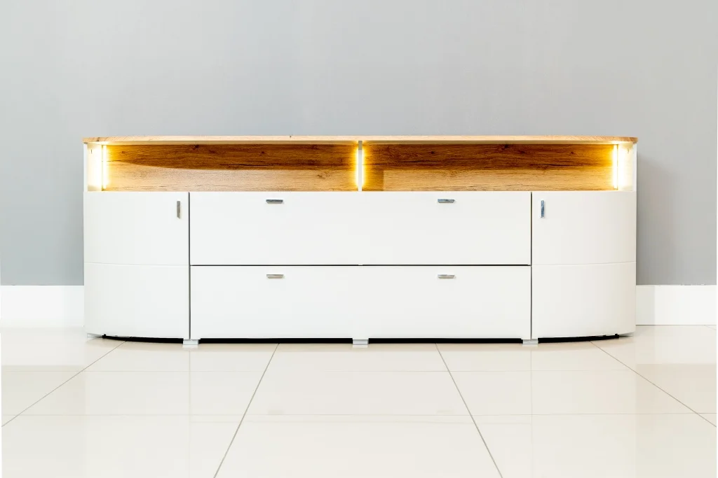 Elegantní TV komoda ANISE 2D2S kombinuje moderní design s praktickým úložným prostorem. Rozměry 220 × 80 × 44 cm zajišťují dostatek místa pro televizi a mediální vybavení. Přední i boky v kombinaci světlé šedé a dubu coast evoke dodávají nábytku nadčasový vzhled, který se hodí do různých interiérů.