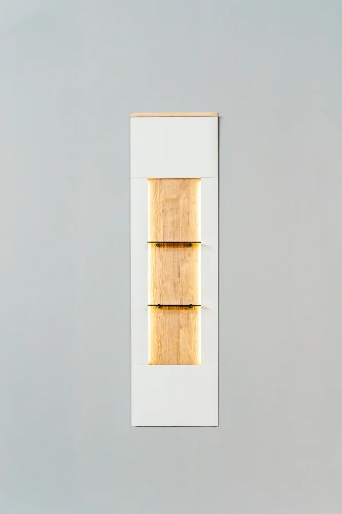 Vyroben je z lamina a skla, což zajišťuje pevnost a snadnou údržbu. LED osvětlení není součástí balení; dodáváno je v demontu, připravené k rychlé montáži na zeď. Skleněné police poskytují lehký vizuální efekt a prostor pro dekorace, knihy i elektroniku, aniž by prostor překryl.
