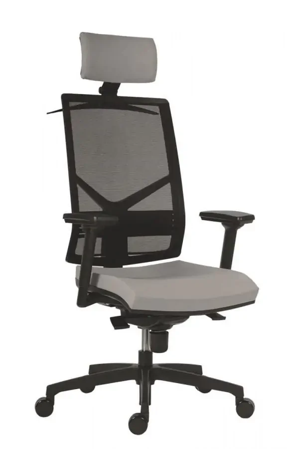 Elegantní moderní kancelářská židle s černým síťovaným opěrákem a nastavitelnou bederní výztuhou nabízí optimální podporu a prodyšnost během dlouhých pracovních hodin. Sedák z komfortní studené pěny zajišťuje pohodlí; dle vzorníku lze vybrat barvu potahu.