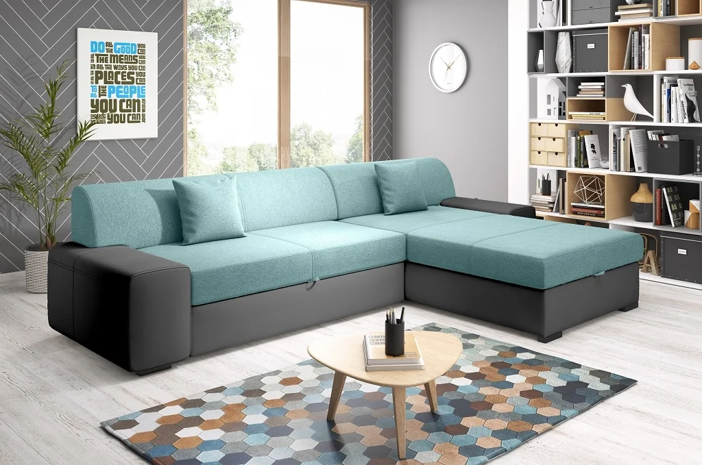 Rohová rozkládací sedačka s pravým orientem nabízí pohodlné sezení a praktické rozkládací lůžko. Obrázek rozkladu je ilustrační a ukazuje jinou barvu. Potahové materiály tvoří kombinace látky Primo 72 v mentolové barvě a ekokože Madryt 1100 v černé.