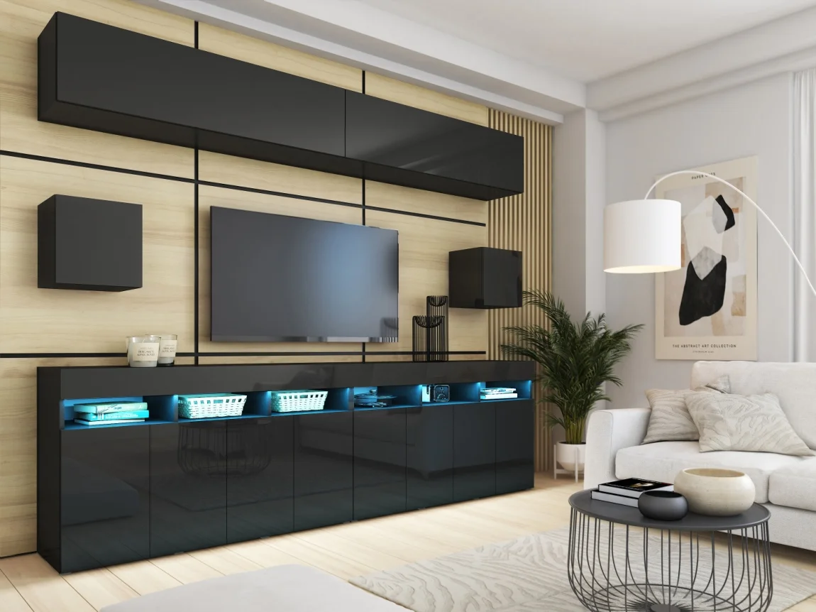 Modulární obývací stěna ANTOFALLA 4 nabízí variabilní uspořádání z dílů, které si vyberete podle prostoru i stylu. Korpus v černé barvě doplňují dvířka s lesklým černým povrchem; materiál lamino o tloušťce 16 mm zajišťuje dlouhou životnost a příjemný vzhled.