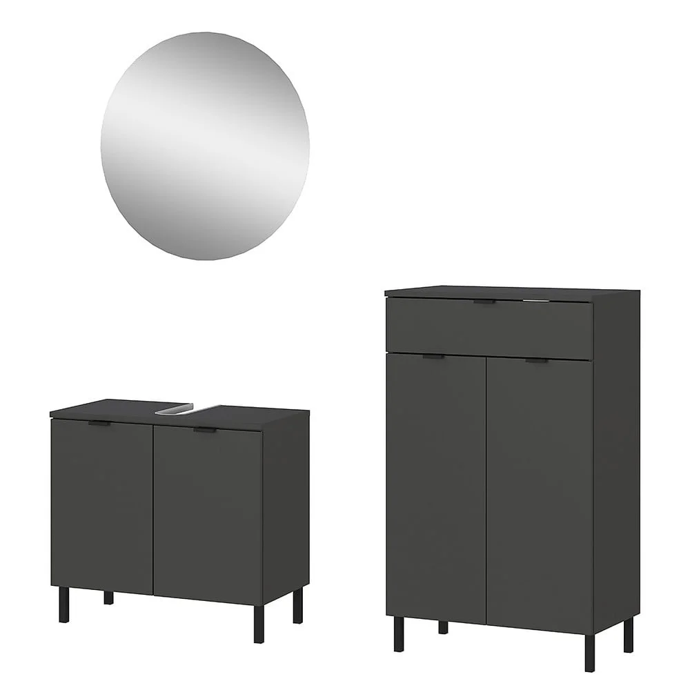 Moderní koupelnová sestava Arcena v elegantní antracitové barvě nabízí praktické rozměry a komfortní uspořádání. Zrcadlo s průměrem 60 cm je ideální pro každou koupelnu, zatímco skříňka pod umyvadlo o rozměrech 60 x 56 x 34 cm poskytne dostatek úložného prostoru pro každodenní potřeby. Velká komoda s rozměry 60 x 97 x 34 cm pak nabízí ještě více místa pro uložení ručníků, kosmetiky nebo dalších koupelnových doplňků. Tento set je skvělým řešením pro moderní a funkční koupelnu, která spojuje estetiku s praktičností.