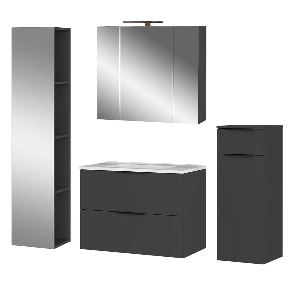 Moderní koupelnová sestava Crandon v antracitové barvě je ideální volbou pro funkční a elegantní koupelnu. Její odolná povrchová úprava z melaminu a kvalitní ABS hrany zajišťují dlouhou životnost a snadnou údržbu. Součástí sestavy je praktické umyvadlo z litého mramoru, které dodává celému setu luxusní vzhled.