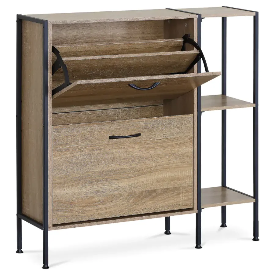 Botník ABO-G1008 v provedení OAK kombinuje praktické úložné prostory s moderním designem. Vyrábí se z MDF desek s povrchovou úpravou v odstínu přírodního dřeva, která je snadná na údržbu. Dveře s výklopnými dvířky poskytují úložný prostor pro obuv a tři otevřené police slouží k uspořádání doplňků či dekorací. Černé kovové nohy a úchyty dodávají botníku stabilitu a industriální nádech. Díky kompaktním rozměrům se hodí do předsíně i menších prostor a dodává se v demontu, což usnadňuje přepravu a montáž.