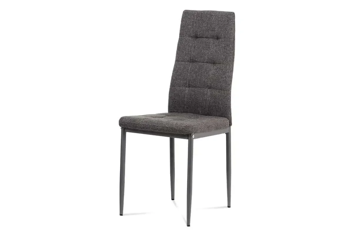 Moderní jídelní židle s jemnou šedou látkou působí elegantně v každé jídelně či kuchyni. Sedák i opěrák jsou stylově prošité, což podtrhuje její vzhled a pohodlí. Pevné kovové nohy s matným lakem antracitové barvy zajišťují stabilitu a dlouhou životnost.