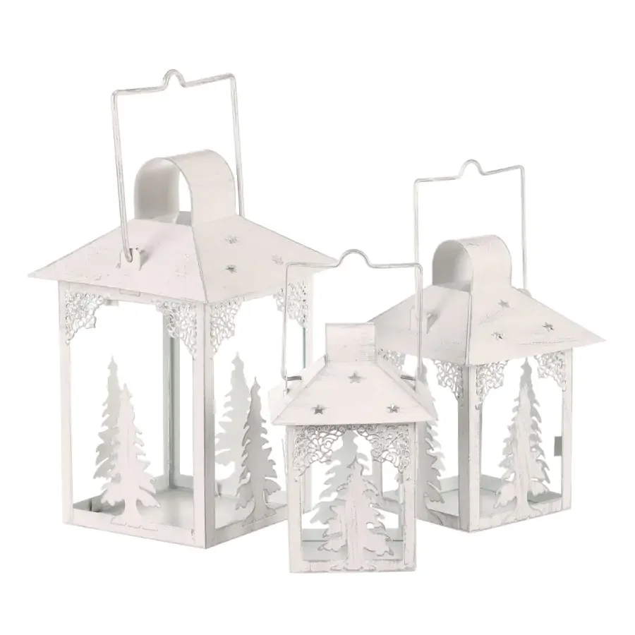 Navoďte romantickou atmosféru s naší sadou tří kovových čtyřbokých luceren LUC301 v bílé barvě, zdobených jemnými jehličnatými siluety stromků. Každá lucerna má na horní straně poutko pro bezpečné zavěšení. Rozměry: S 11x11x15 cm, M 13x13x19 cm, L 15x15x25 cm. Umístíte-li je na zahradu nebo parapet, vytvoří krásnou a jemnou atmosféru s teplým světlem, které dokonale podtrhne klidné večery. Vintage provedení záměrně zahrnuje drobné škrábance a patinu; to není závada, ale součást stylu.