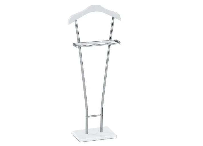 Provedení: Němý sluha s chromovaným rámem a bílou základnou s ramínkem je praktický doplněk do ložnice, šatny či koupelny. Navržený pro snadné odkládání oděvů a doplňků, šetří místo a zároveň vytváří čistý, moderní vzhled.