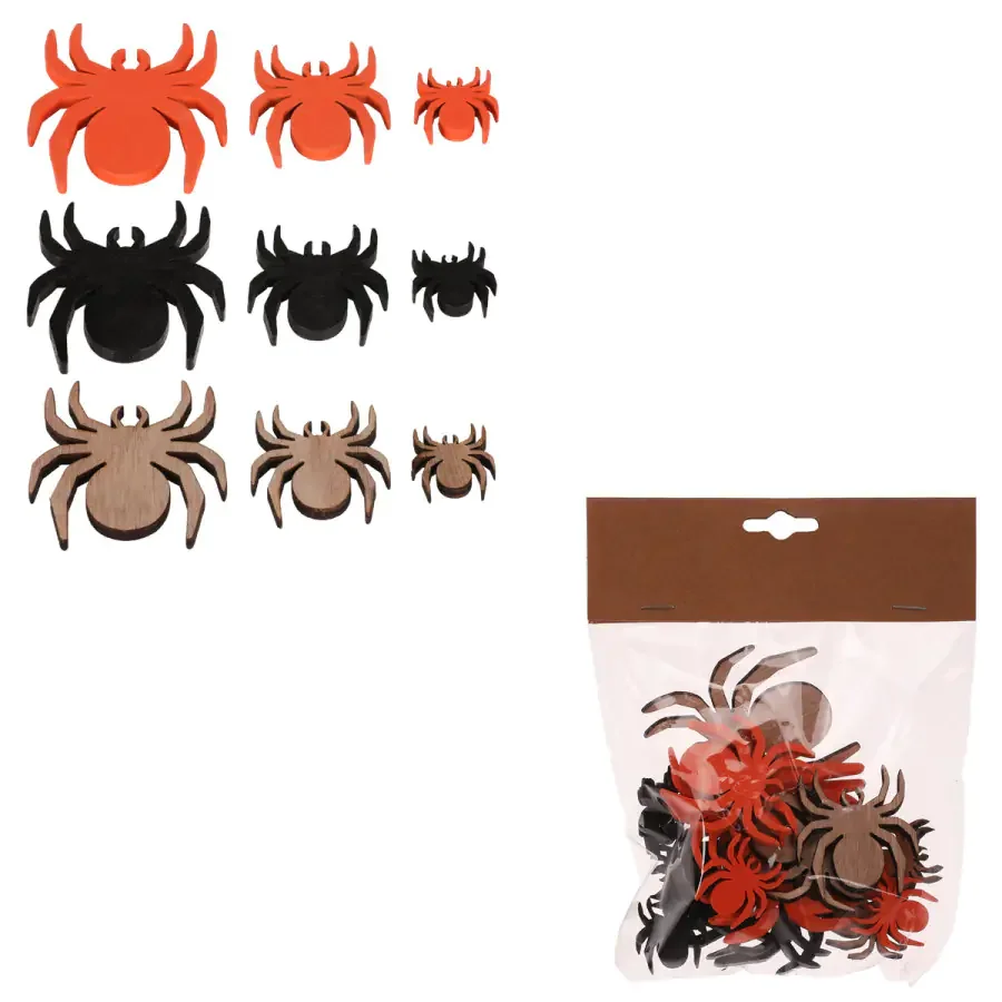 Vytvořte dokonalou podzimní a Halloween atmosféru s dřevěnými ozdobami ve tvaru pavouků. Balení obsahuje 18 kusů v jednom sáčku a nabízí mix barev – oranžová, černá a přírodní odstín dřeva – přičemž každá z nich dorůstá do tří různých velikostí.