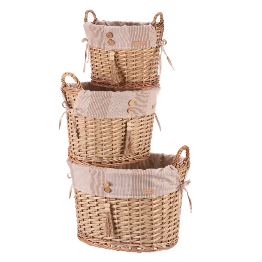 Udržení pořádku v domácnosti dostává nový rozměr díky sadě tří proutěných košů, které spojují praktičnost s elegantním vzhledem. Koše se snadno umístí do šatníků, polic či regálů a díky bočním úchytům pro pohodlné přesouvání zvládnete změny uspořádání jedním tahem. Každý koš má vyjímatelnou látkovou výstelku se vzorem pruhů a dekorativními knoflíky, které doplňují jeho vzhled. V balení získáte koše ve třech rozdílných velikostech: malé 29x20x22 cm, střední 36x26x26 cm a velký 45x32x30 cm. Tato sada usnadní organizaci věcí v domácnosti a zároveň přinese stylový doplněk do každé místnosti.