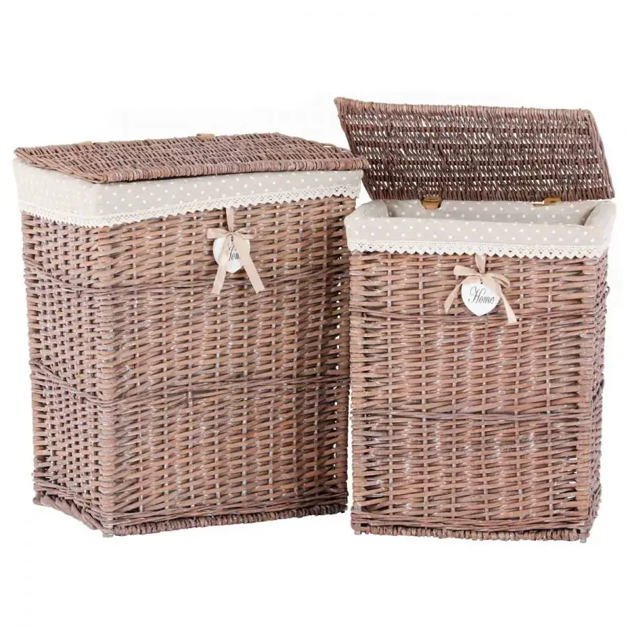 Sada dvou košů na prádlo z přírodního hnědého proutí kombinuje nadčasový vzhled s praktickým využitím v domácnosti. Každý kus zdobí jemné mašličky a motiv srdíčka s nápisem Home, které dodají útulný nádech interiéru.