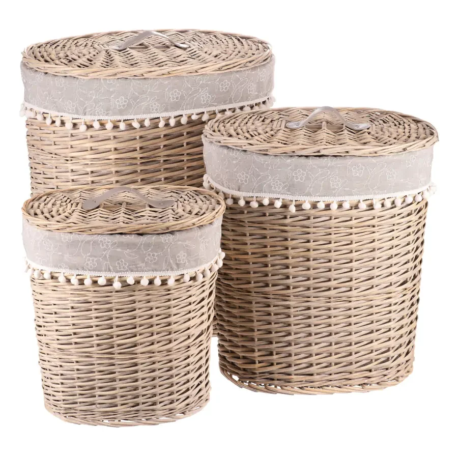 Elegantní a praktický doplněk do každé domácnosti, který zvládne uspořádat špinavé prádlo — sada tří oválných košů s víkem. Víko chrání obsah před prachem a pachy, což pomáhá udržet prádlo čerstvé. Proutěné provedení v přírodní barvě doplňuje světlá šedá látka s jemným květinovým vzorem a ozdobnými třásněmi, díky čemuž koše působí lehce a elegantně. Minimalistický design se hodí do každého interiéru a díky různým velikostem se snadno přizpůsobí prostoru. Rozměry jednotlivých košů: malý 33×21×36 cm, střední 41×29×45 cm a velký 49×36×55 cm. V balení navíc získáte praktické řešení pro třídění prádla, které zároveň šetří místo a udržuje pořádek.