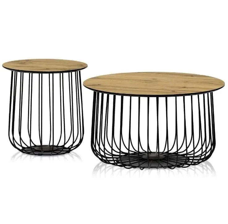 Deska z MDF tloušťky 18 mm má spodní stranu v matné černé a horní plochu v 3D dekoru divokého dubu. Konstrukce ze štíhlých kovových profilů v černém matu zajišťuje lehký, ale stabilní základ. Větší stolek má Ø60 cm a výšku 34 cm, menší Ø37 cm a výšku 37 cm; nosnost obou kusů je 25 kg. Díky univerzálnímu designu se snadno sladí s různými interiéry – obývací pokoj, pracovna i ložnice. Navíc lze stoly jednoduše kombinovat dle potřeby, což oceníte zejména v menších prostorách. Je to praktické řešení pro rychlou změnu uspořádání v každé místnosti.