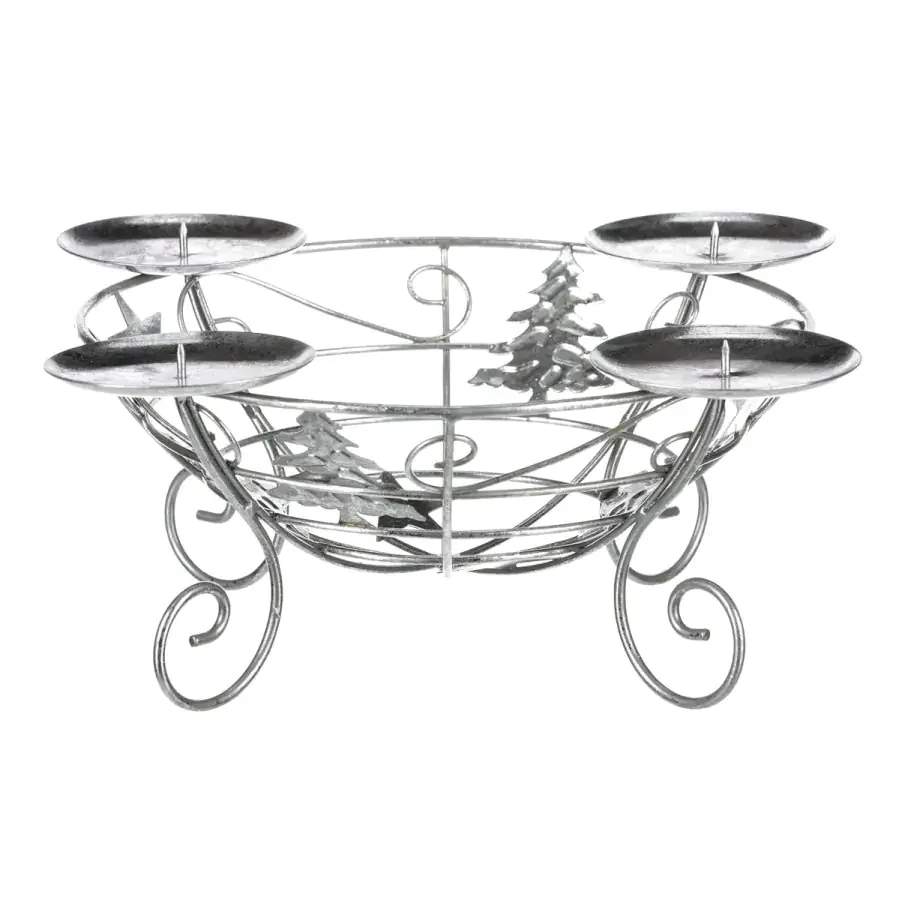 Tento kovový svícen ve stříbrné barvě slouží jako pevný základ pro vaši adventní výzdobu. Kovová konstrukce je vybavena čtyřmi držáky pro širší svíčky, takže bez problémů pojme vaše oblíbené dekorativní svíčky. Ornamenty ve tvaru stromečků a hvězd dodávají tradiční vánoční nádech a podtrhují atmosféru svátků. Nebojte se kombinovat s dalšími ozdobami a doplňky a vytvořte si tak jedinečnou adventní scenérii. Díky univerzálnímu a elegantnímu designu se snadno sladí s různými interiérovými styly a barevností svíček. Při použití zaujme čistý, moderní vzhled, který ozdobí každý prostor a vydrží i dlouhé adventní dny.