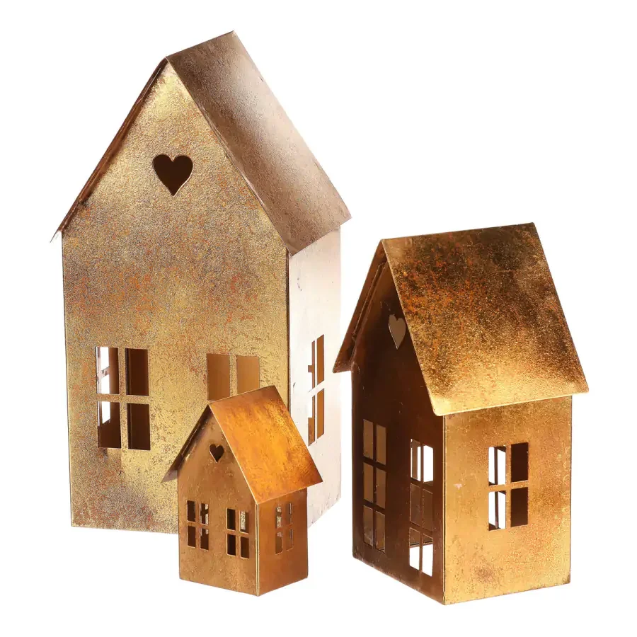 Elegantní kovový svícen UM1042 inspirovaný vintage stylem má tvar patrového domu a vyniká teplým měděným odstínem, který vašemu prostoru dodá jedinečný šarm. Sada obsahuje tři odlišné velikosti, jež lze uspořádat dohromady pro efektní kompozici nebo používat samostatně podle potřeby. Každý kus přináší atmosféru útulnosti a hřeje světlem svíček, které do kovu odráží jemný lesk. Rozměry: L 18x15x35 cm; M 14x12x24 cm; S 8x7x13 cm. Užijte si krásu světla vloženého do tohoto svícnu a nechte se jeho kouzlem okouzlit. Díky variabilitě velikostí se hodí na stůl i polici a skvěle doplní jak rustikální, tak moderní interiér. Tento kus navíc skvěle funguje jako stylový doplněk pro romantické večeře či večírky, a může být hezkým dárkem pro milovníky atmosférických světel.