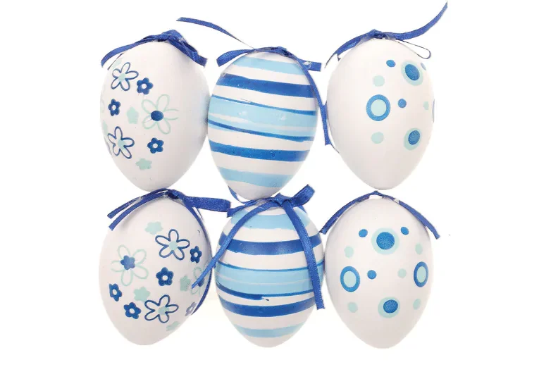 Ozdobný set Velikonoc vyrobený z plastu v kombinaci modro-bílé, s poutkem pro snadné zavěšení. V balení naleznete šest kusů o velikosti přibližně 6 cm. Je ideální pro rychlou a jednoduchou výzdobu domova, oken či dveří. Dekorace je lehká a snadno ji rozvěsíte, takže výsledek vypadá svěže a elegantně. Upozornění: není hračka.