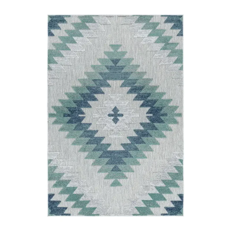 Venkovní koberec s poutavým 3D geometrickým vzorem ozvláštní každou terasu. Je vyroben z polypropylenu heatset, který zajišťuje dlouhou životnost, stálé barvy a snadnou údržbu. Kombinace krátkých pevných smyček a vyššího střiženého vlasu vytváří plastický 3D efekt, jenž dodává vzoru hloubku. Po obvodu je koberec obšitý, což zvyšuje jeho pevnost a zabraňuje třepení; antistatická úprava snižuje nežádoucí prach. Výška vlasu činí 5 mm. Koberec se hodí pro vnitřní i venkovní použití a díky své multifunkčnosti skvěle padne na terasu, verandu nebo do altánu.