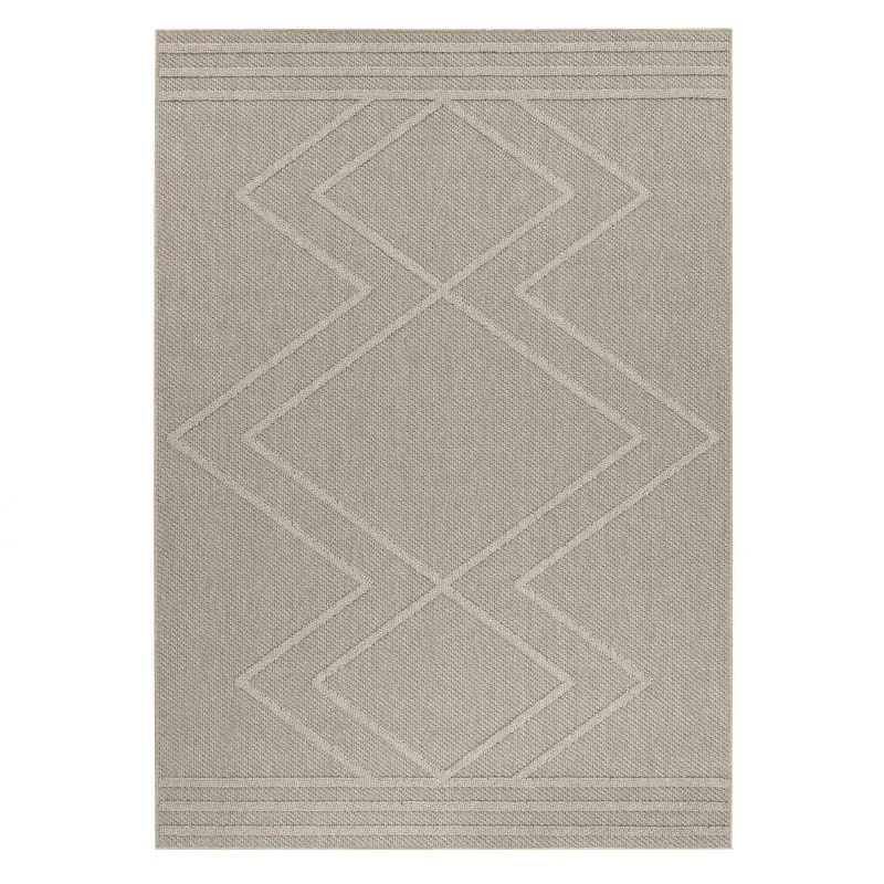 Venkovní koberec Ayyildiz Patara 4954 v béžové barvě zaujme vzorem se třemi kosočtverci uprostřed a třemi lemujícími pruhy na kratších stranách.