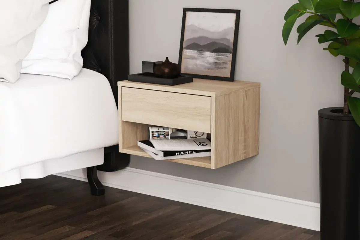 AZILA Noční stolek v minimalistickém stylu představuje praktické řešení pro menší ložnice, které šetří místo vedle postele. Můžete ho upevnit na stěnu ve vámi zvolené výšce a mít vše důležité na dosah.