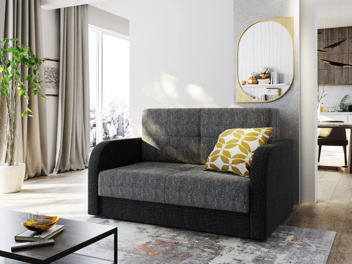 Multifunkční pohovka s funkcí spaní je praktickým řešením pro obývací pokoj i dětský pokoj a nabízí pohodlí při každodenním užívání. K dispozici jsou dvě varianty potahu: kornet 02 – šedá látka s bílo-černým prošíváním a kornet 10 – černá látka se stejným prošíváním.
