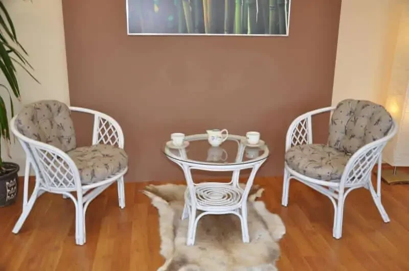 Polstrování lze prát na 40 °C. Spoje ratanové konstrukce jsou šroubované, což zajišťuje pevnost a snadnou údržbu. K dispozici jsou i další barevné varianty. Rozměry křesla: 68x66x73 cm, nosnost 110 kg; stolek: průměr 65 cm, výška 55 cm. Tento typ soupravy lze objednat i v jiném barevném provedení.