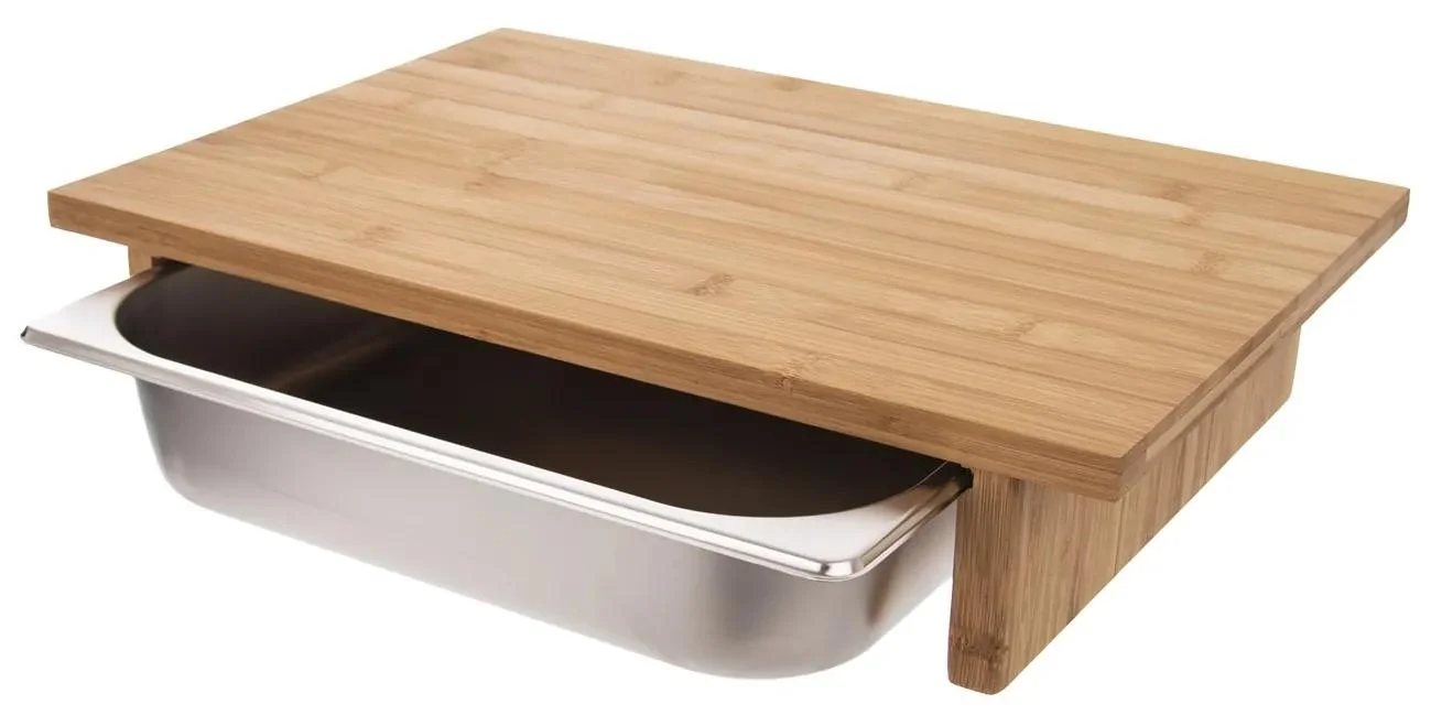 Toto praktické kuchyňské prkénko vyrobené z kvalitního bambusového dřeva je ideální pro efektivní přípravu surovin. Integrovaný nerezový zásobník umožňuje pohodlné sbírání nakrájené zeleniny nebo masa přímo při práci, což usnadňuje následné marinování nebo přenášení ingrediencí.