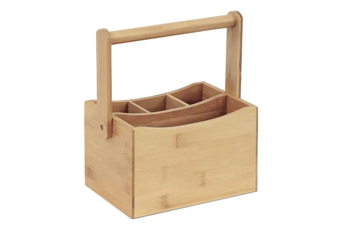 Praktický úložný stojan na příbory je vyroben z bambusu, který dodává výrobku přírodní vzhled a ekologický ráz. Stojan má 4 přihrádky pro pohodlné uložení veškerých příborů i ubrousků. Díky pevné konstrukci a kompaktním rozměrům se hodí do venkovského i stylově laděného interiéru a najde uplatnění i v restauracích. Snadno s ním přenesete větší množství příborů pro celé hosty u stolu. Rozměry: 20,3 x 14 x 12,7 cm. Prohlédněte si v naší nabídce i další kuchyňské doplňky.