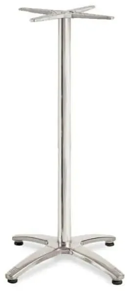 Barová centrální podnož Roma 4 disponuje sloupkem o průměru 6 cm z leštěného hliníku a litinovým podstavcem, který je krytý leštěným nerezovým plechem. Montážní kříž má rozměr 48×48 cm a je vhodný pro desky o rozměrech 60×60 cm, případně pro kulatou desku o průměru 70 cm.