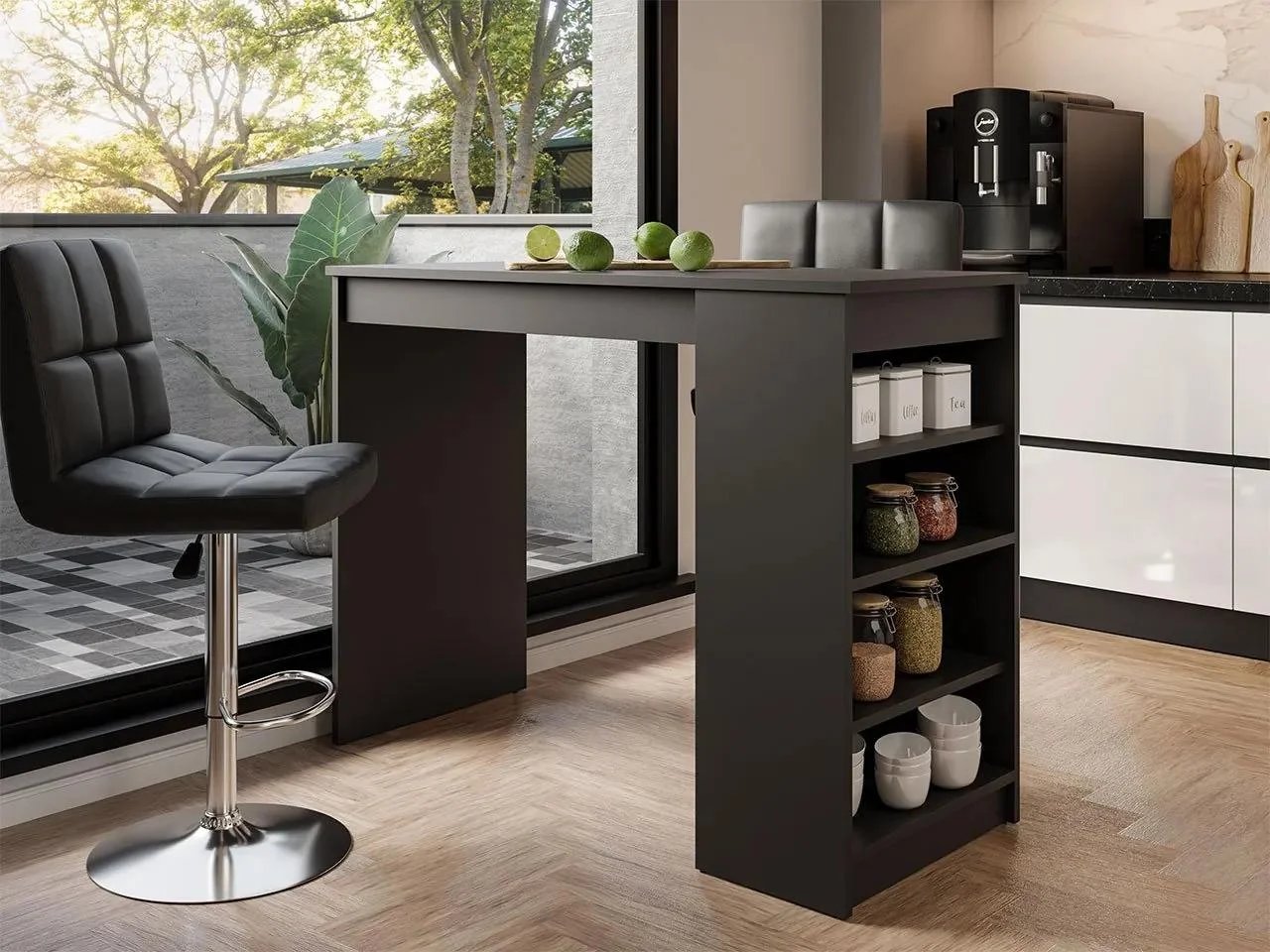 Elegantní a funkční barový stůl BIRKET v černé barvě je ideální volbou pro moderní kuchyně či obývací prostory. Díky boční policí nabízí praktický prostor pro dekorace nebo drobné kuchyňské potřeby, zatímco nosnost až 30 kg zaručuje stabilitu a pevnost.