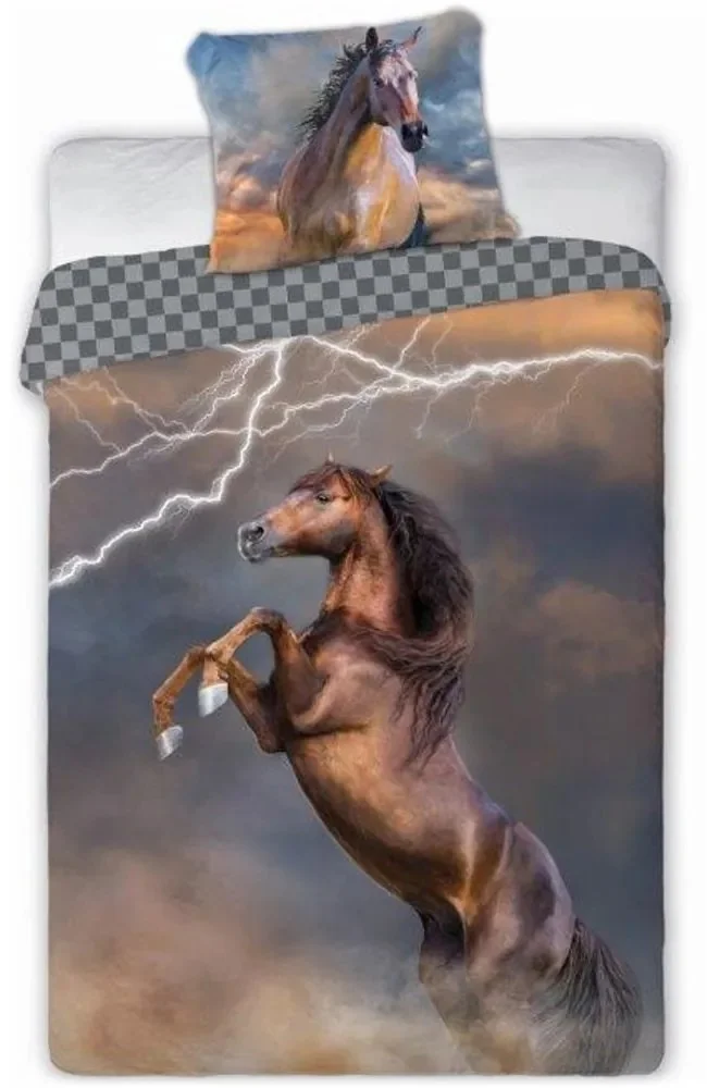 Představujeme originální oboustranné ložní povlečení, ideální pro nadšence koní a zvířecí milovníky. Na lícní straně přikrývky dominuje detailní obrázek elegantního arabského plnokrevníka s dramatickým pozadím, zatímco druhá strana je v decentní šedé barvě s klasickým šachovnicovým vzorem.