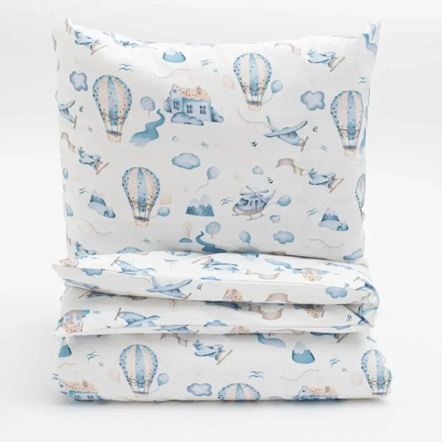 Představujeme jemný bavlněný set do postýlky New Baby Romance, který zahrnuje polštářek a peřinku s motivem pohádkového dobrodružství v oblacích. Potisk přináší dětem kouzelnou scénu a podporuje klidný a sladký spánek.