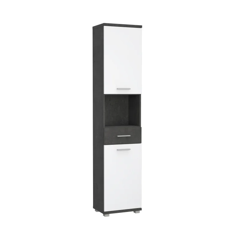 Vyrobena je z lamina s tloušťkou 15/22 mm a má plastový úchyt pro pohodlné ovládání. Korpus je v odstínu tmavě šedý beton, dvířka pak v kombinaci tmavě šedého betonu a bílého lesku, což působí elegantně a nadčasově. Skříňka se dodává v demontu, montáž je tedy rychlá a snadná. Produkt navíc disponuje pětiletou zárukou, která potvrzuje její kvalitu a dlouhou životnost.