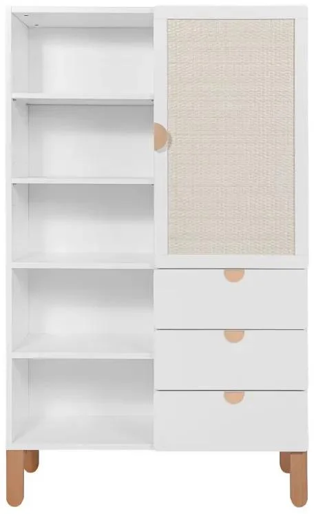 Elegantní a praktická dětská knihovna v bílé barvě, navržená pro bezpečné a přehledné uspořádání knih a hraček. Vyrobena z kvalitního lakovaného MDF, lamina a ratanového pletení, nabízí pět odolných polic, tři zásuvky a skříňku s dvířky s automatickým zavíráním.