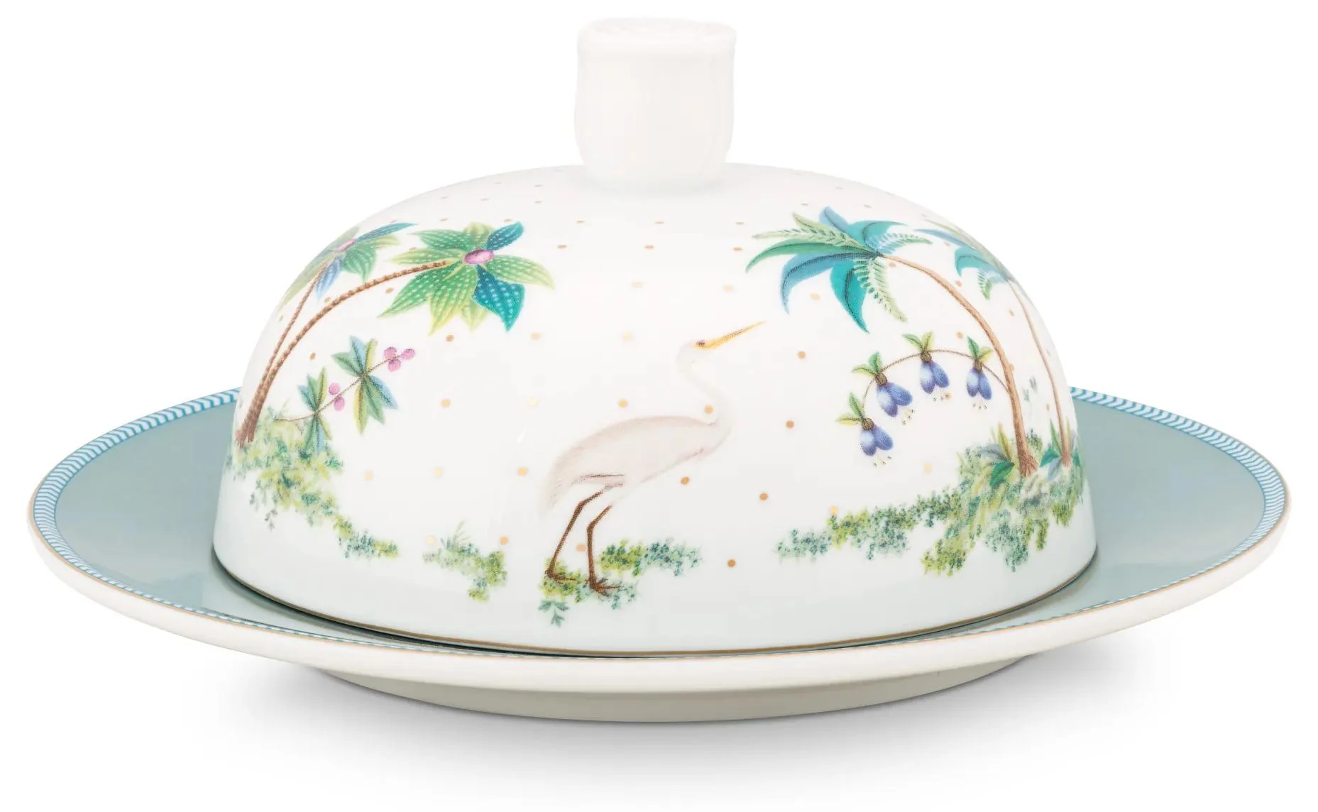 Objevte kouzlo exotiky s ikonickou kolekcí Jolie od Pip Studio. Tato bílá máselnička z jemného porcelánu, ozdobená zlatými puntíky, modrými akcenty a malovanými scénami dalekých ostrovů, je ideální pro přivítání jara ve vašem domově.