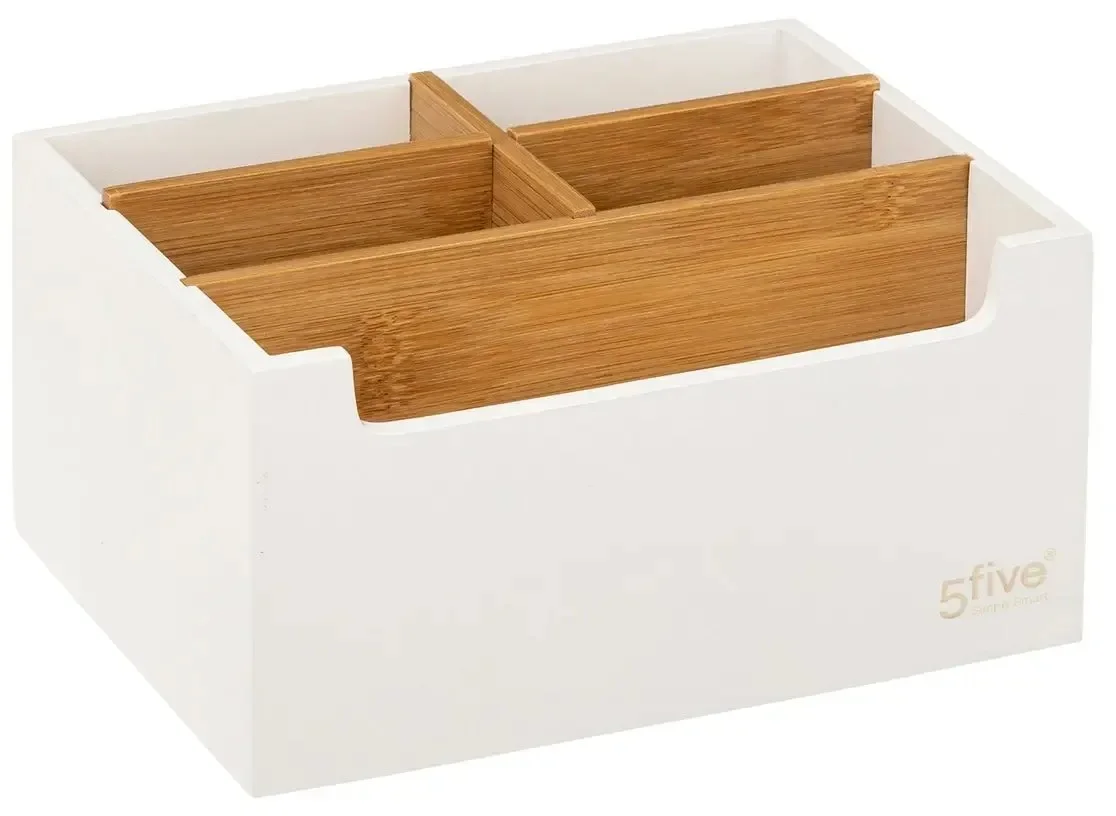 Praktický zásobník s pěti prostornými přihrádkami, ideální pro uspořádání drobností v domácnosti nebo kanceláři. Vyrobený z kvalitního MDF s elegantním přírodním a bílým odstínem, tento organizér kombinuje styl a funkčnost.