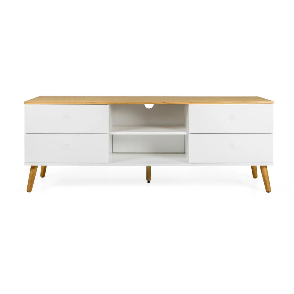 Tento elegantní bílý TV stolek kombinuje moderní design s přírodním akcentem díky nohám z dubového dřeva. Díky své šířce 162 cm poskytuje dostatek prostoru pro vaše multimediální zařízení i dekorace.