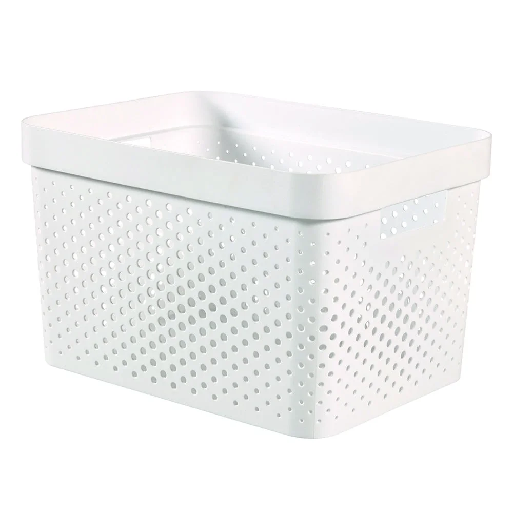 Praktický bílý úložný koš od značky Curver s objemem 17 litrů je ideálním řešením pro organizaci vašeho domova či kanceláře. Díky jeho modernímu designu s motivem Infinity Dots se snadno hodí do jakéhokoliv interiéru a zároveň nabízí dostatek prostoru pro ukládání různých předmětů.