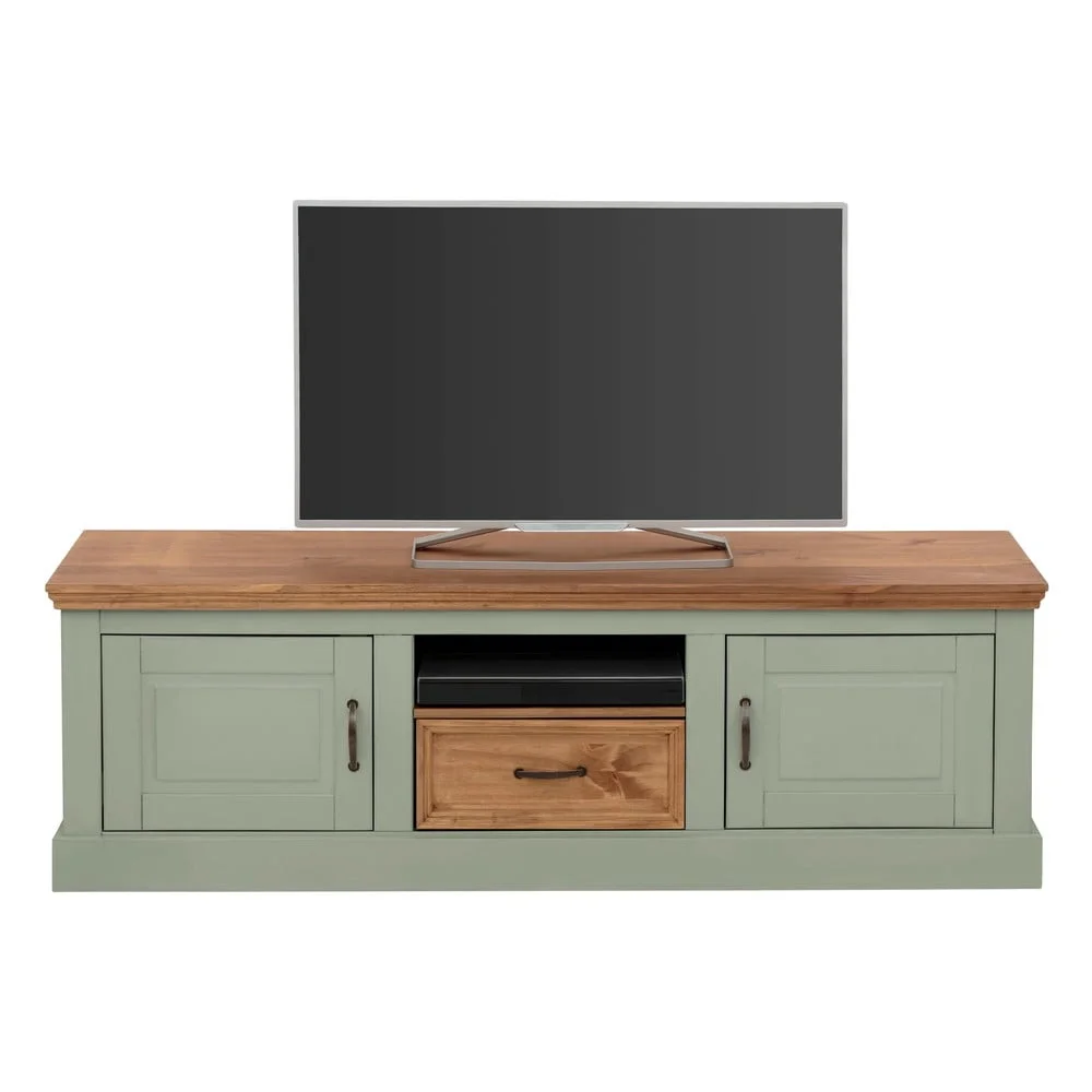Elegantní TV stolek z borovicového dřeva v jemné světle zelené barvě nabízí ideální kombinaci funkčnosti a stylu. S rozměry 160x50 cm je dostatečně prostorný na vaše elektronické zařízení, zatímco jeho přírodní vzhled dodává interiéru příjemnou atmosféru.