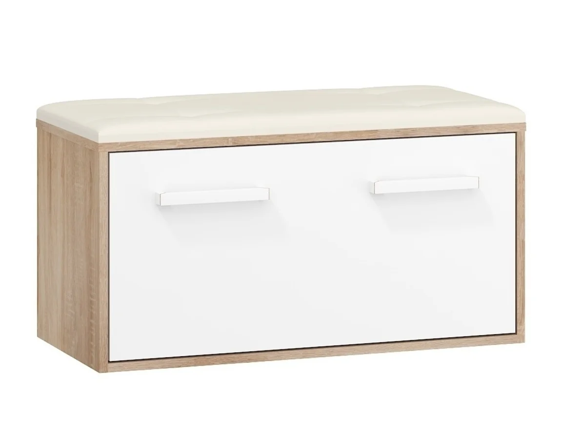 Botník Dorinda kombinuje béžovou ekokůži s dekorem dub sonoma a bílými akcenty, aby zapadl do moderní předsíně. Rozměry 84 x 45 x 41 cm poskytují dostatek prostoru pro celou rodinu a zároveň jistou stabilitu při každodenním používání.