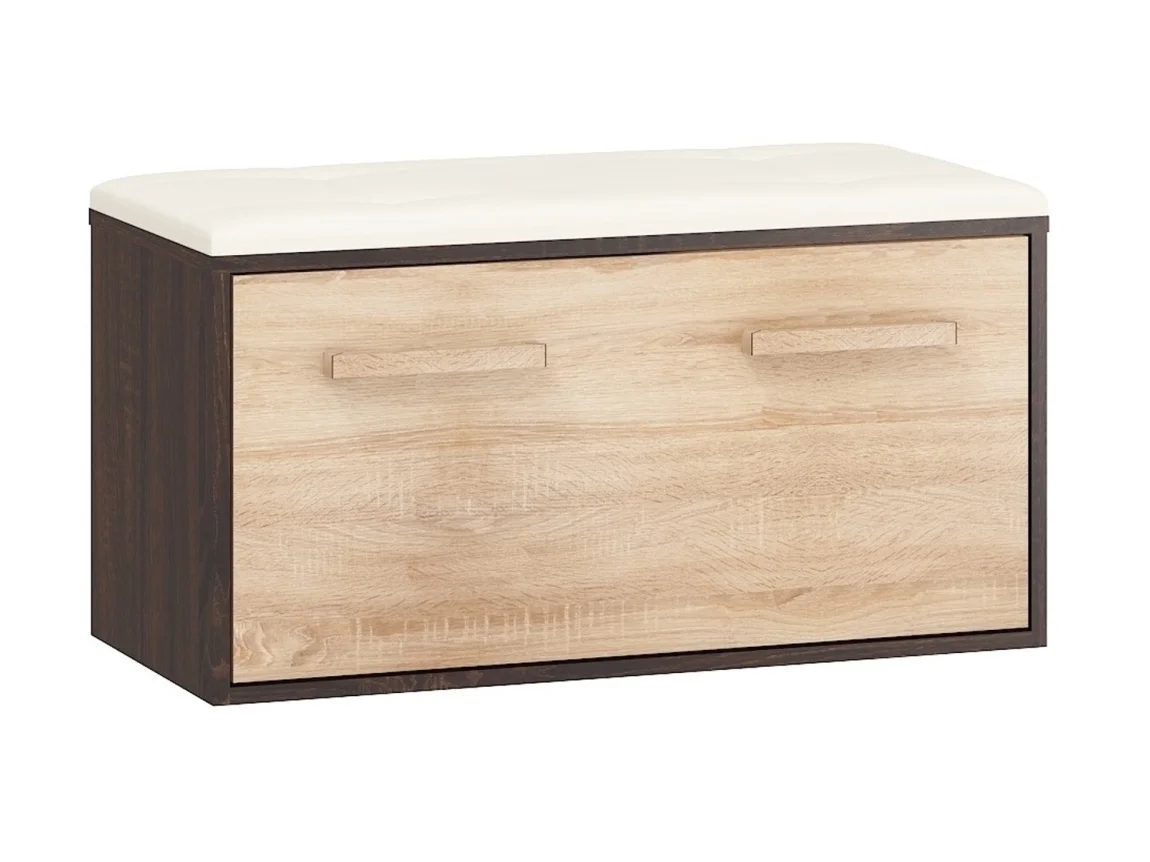 Botník DORINDA kombinuje hnědou ekokůži s dekorem dub sonoma tmavý, čímž dodá vstupnímu prostoru moderní vzhled. Deska z LTD a ABS hrany zajišťují pevnou a odolnou konstrukci. Rozměry 84 × 45 × 41 cm poskytují dostatek prostoru pro obuv různých velikostí.