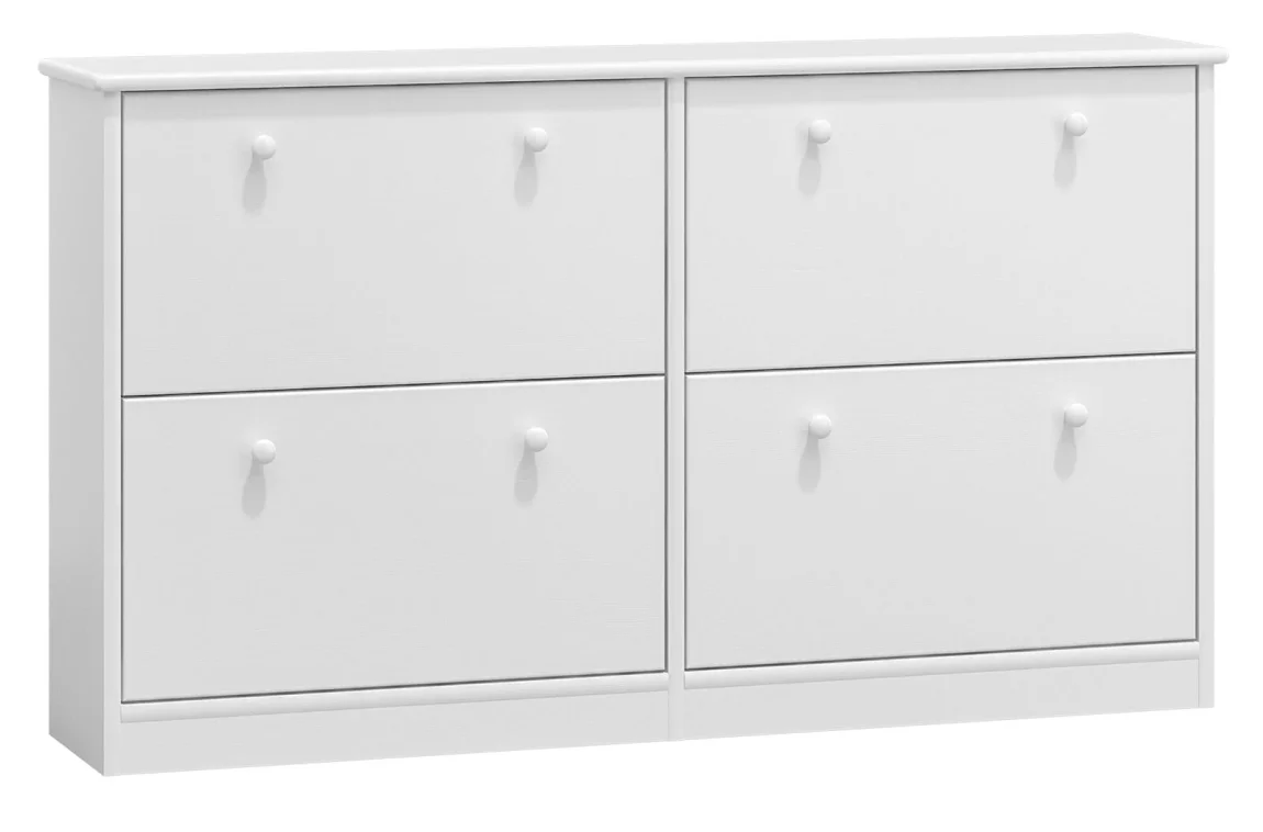 Botník KARUN 16 se čtyřmi výklopnými dvířky je vyhotoven z masivu borovice a ošetřen bílým mořidlem. Rozměry 80 cm výšky, 140 cm šířky a 29 cm hloubky zajišťují dostatek úložného prostoru pro celou rodinu. Dodání probíhá v demontu, montáž je snadná podle přiloženého návodu. Díky světlému finálnímu provedení a pevnému zpracování se hodí do moderních i tradičních interiérů a působí vzdušněji. Tato kombinace přírodního materiálu a bílé úpravy poskytuje dlouhou životnost a jednoduchou údržbu, stačí občas otřít a botník zůstane pěkný dlouhá léta.