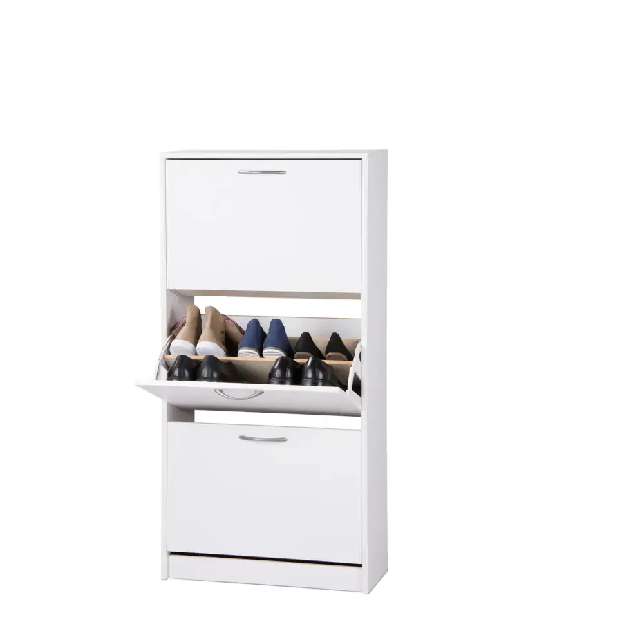 Botník je vyroben z laminované dřevotřísky v bílé barvě, díky čemu působí čistě a moderně. Tři výklopné zásuvky, uspořádané ve dvou řadách nabízejí prostor pro 18 párů bot. Zadní stěna chybí; zadní část je vyztužena pro lepší stabilitu. Díky svému univerzálnímu designu se hodí do předsíně, haly či garáže a poskytuje praktické úložné řešení pro obuv. Dodáváno v demontu.