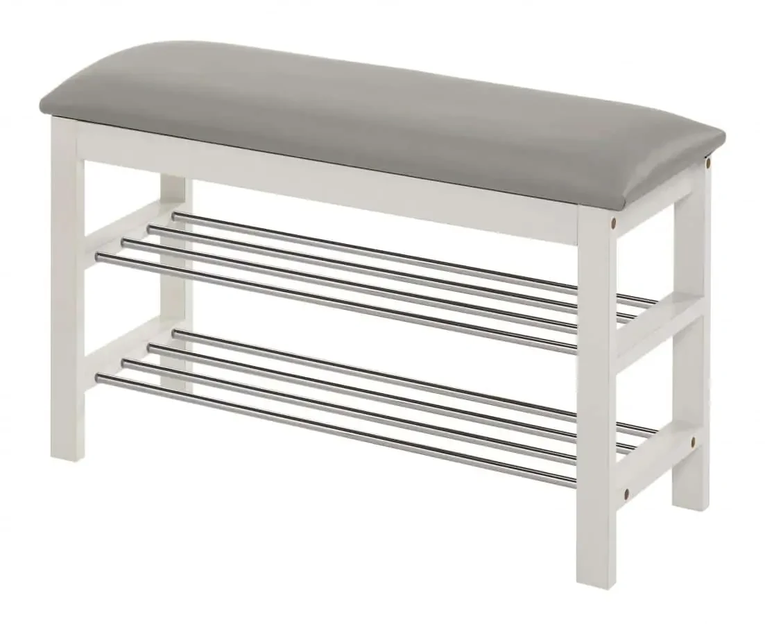 Botník ST-11 Halmar je praktické a nenáročné řešení pro odkládání obuvi s dvěma řadami prostoru a pohodlným čalouněným sedátkem. Konstrukce kombinuje bílé laminované MDF s odkládací částí z chromované oceli, což zaručuje stabilitu a čistý vzhled.